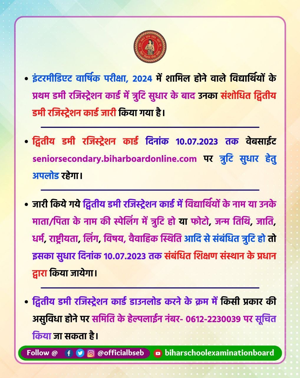 इंटरमीडिएट वार्षिक परीक्षा, 2024 के लिए रजिस्ट्रेशन कराये हुए विद्यार्थियों के रजिस्टर्ड मोबाइल नंबर पर भी डमी रजिस्ट्रेशन कार्ड जारी करने एवं त्रुटि सुधार हेतु समिति द्वारा विद्यार्थियों को Message भेजा जा रहा है। इस प्रकार विद्यार्थी स्वयं भी समिति के वेबसाइट पर डमी रजिस्ट्रेशन कार्ड Link पर Click करने के बाद खुले पेज पर +2 विद्यालय / महाविद्यालय कोड, नाम, पिता का नाम एवं जन्म तिथि प्रविष्ट करते हुए अपना डमी रजिस्ट्रेशन कार्ड डाउनलोड कर सकते हैं।