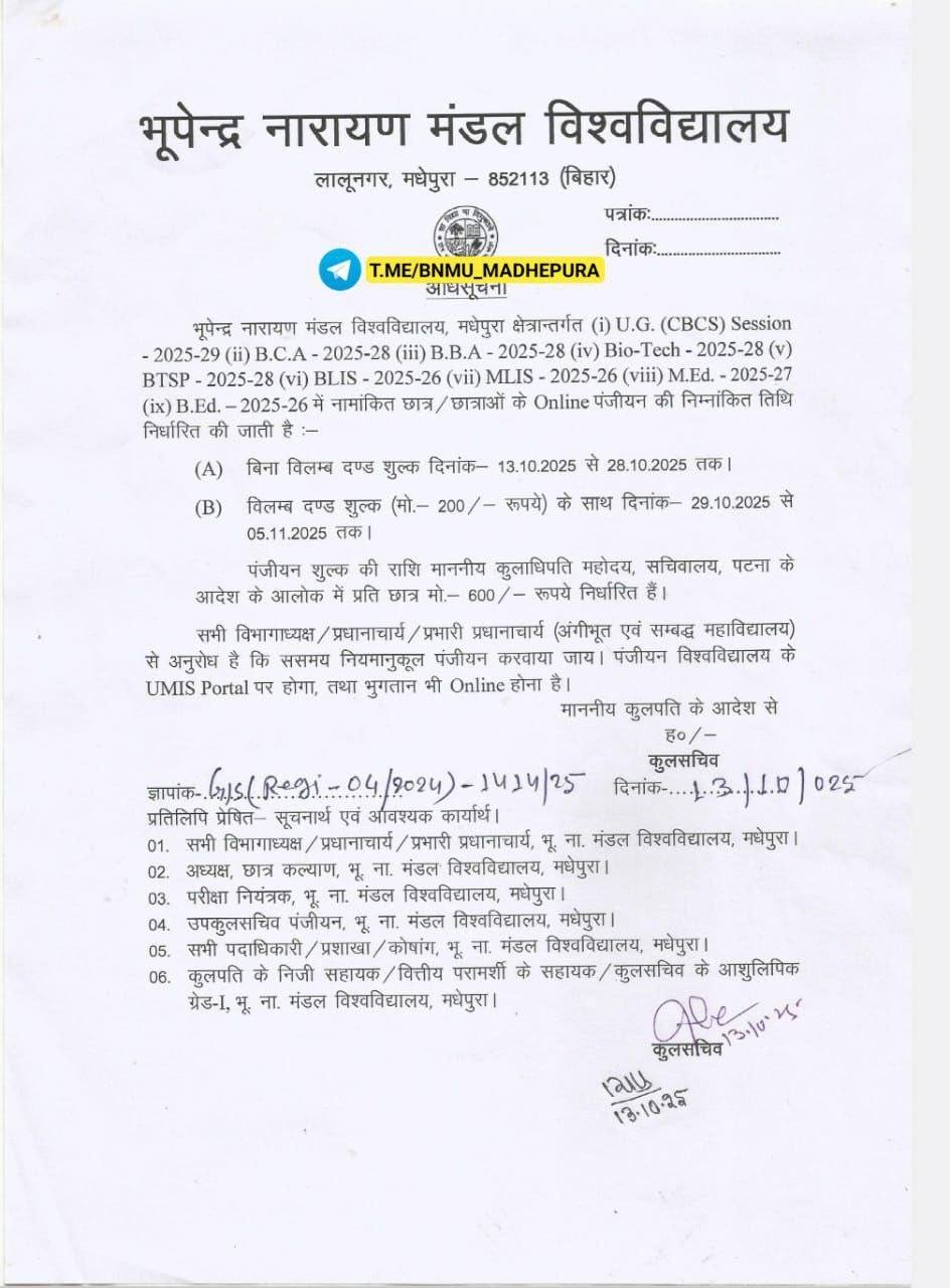 BNMU स्नातक प्रथम सेमेस्टर (सत्र 2025-29) पंजीकरण सूचना
